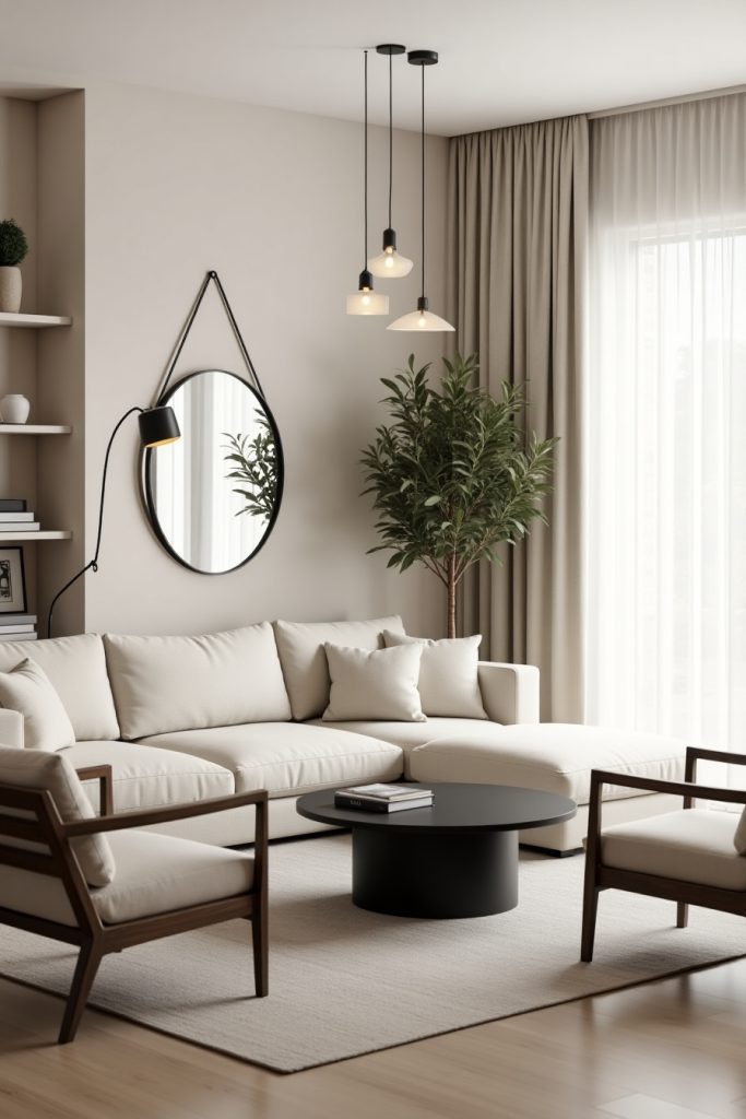 Lighting sets the mood in a modern living room! Try a sleek floor lamp or pendant light in matte black.