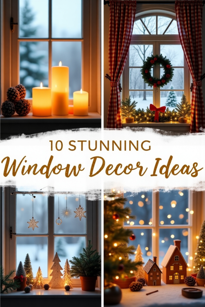 On the sill, set up a mini Christmas village with pinecones and candles for a whimsical, holiday scene.
